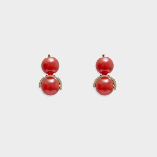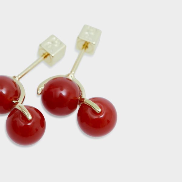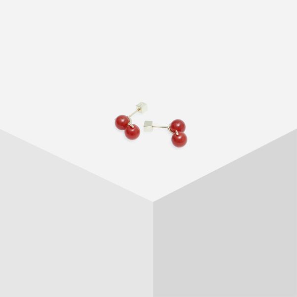 Gold plated earrings detailed with two cornelian beads. Cube-shaped fastening.