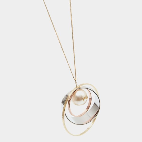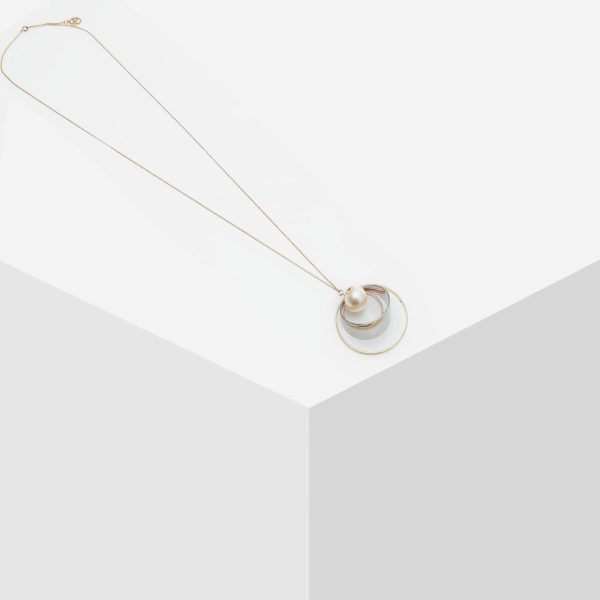 Gold plated necklace featuring a thin chain and a faux pearl-detailed pendant with overlapping hoops.