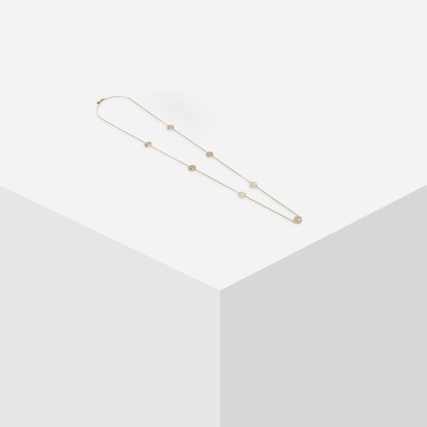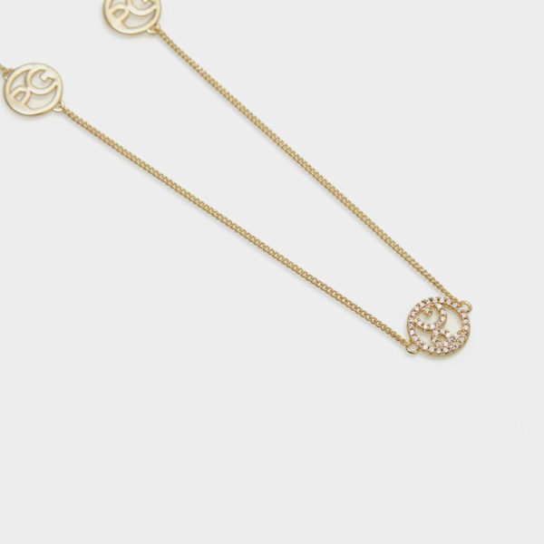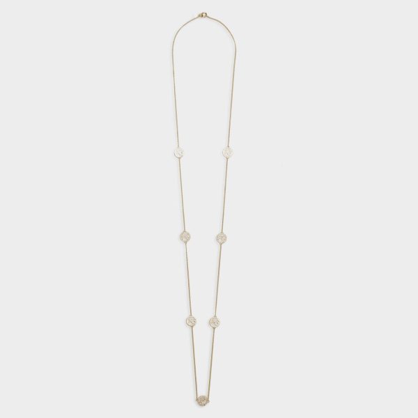 Gold plated necklace featuring a long chain and crystal-embellished PG medallions.