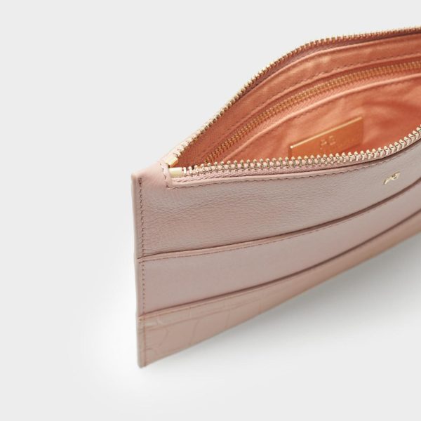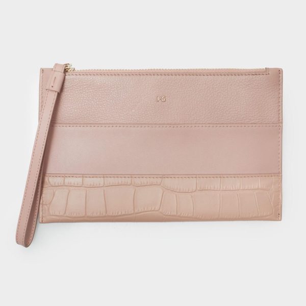 Leather pouch with a patchwork design in different textures. Zip fastening.