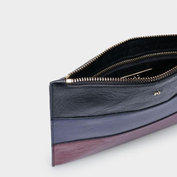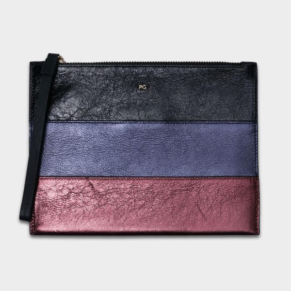 Leather pouch with a patchwork design in metalic finish and PG logo. Zip fastening and interior zip pocket.