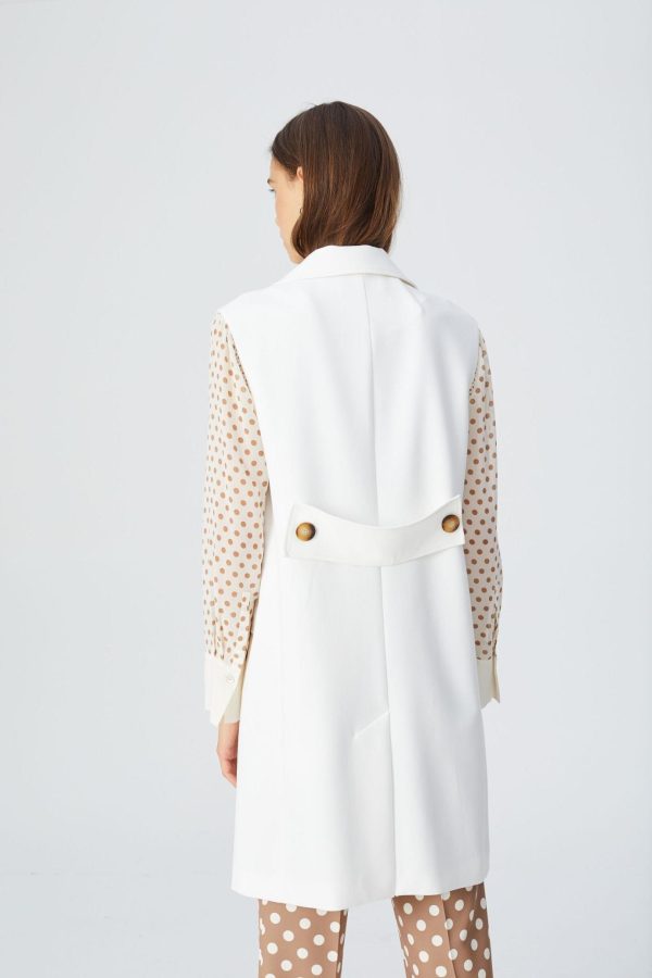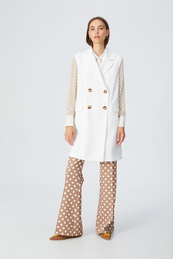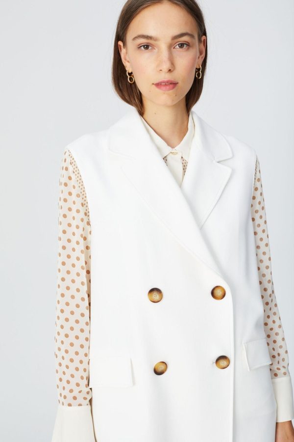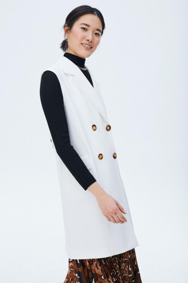 Longline double-faced gilet with a double-breasted design. Peaked lapels, button-fastening and front flap pockets. Model is 180 cm | 5’10” and is wearing a size Medium.
