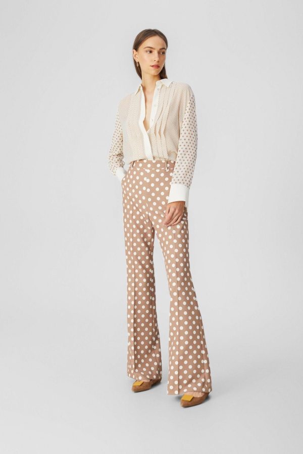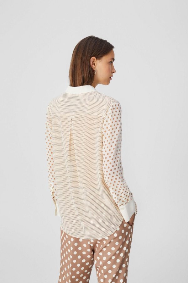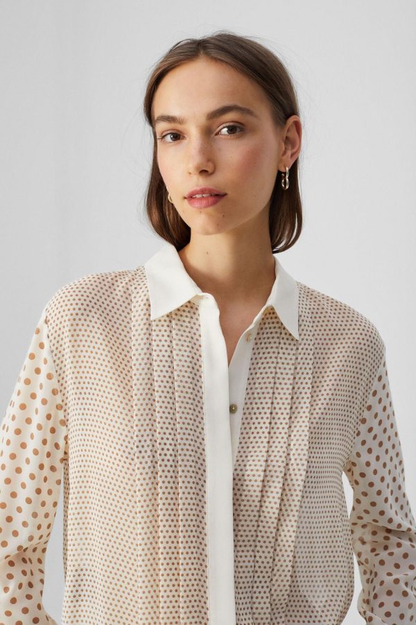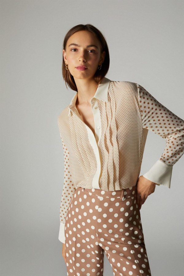 Crepe fluid shirt with contrasting polka dots, pleated detail at the front and wide cuffs. Model is 180 cm | 5′ 10″ and is wearing a size 38.