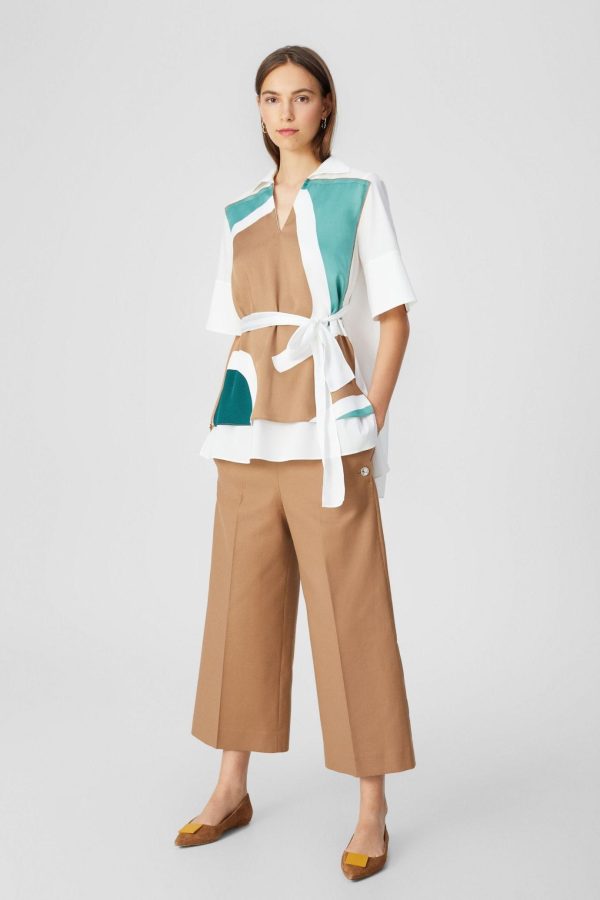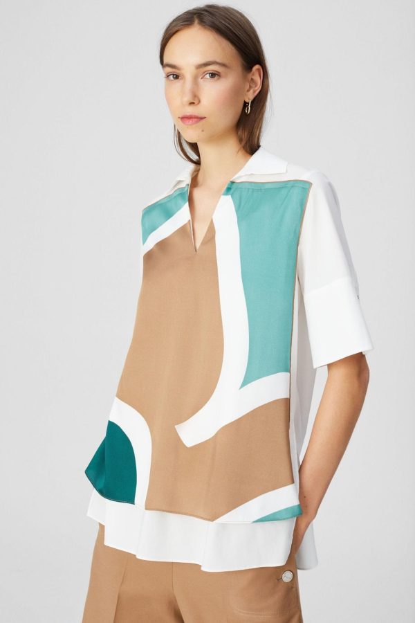 Straight fit shirt in printed twill with a cotton poplin back. Shirt collar, detachable belt and short sleeves. Model is 180 cm | 5′ 10″ and is wearing a size Small.