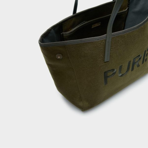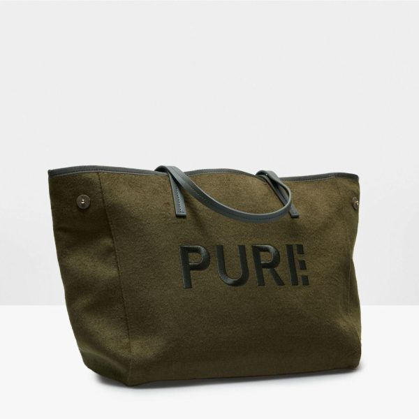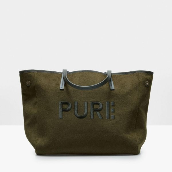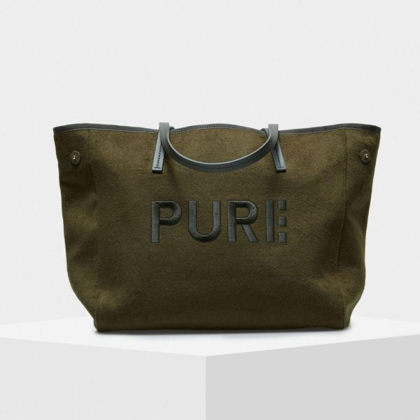 Large shopping bag in felt embroidered with our PURE logo. Leather shoulder straps, side snaps and an interior zipped pocket.