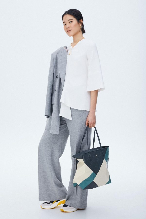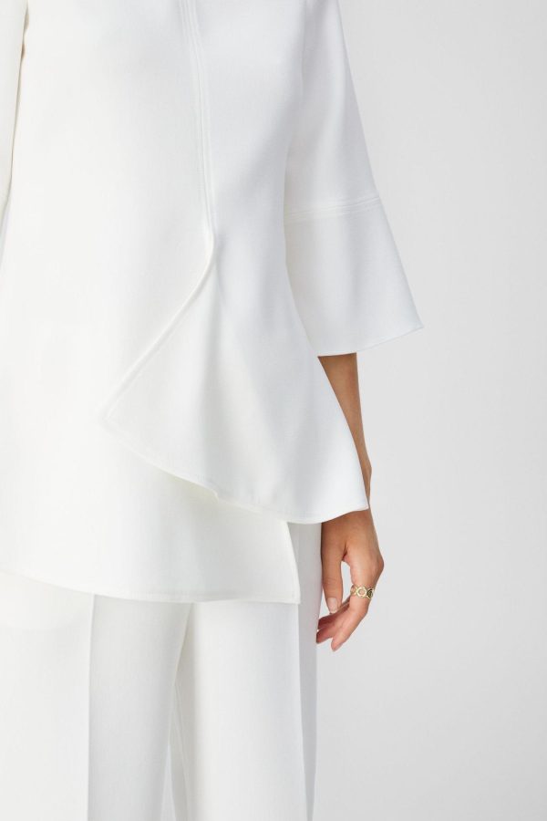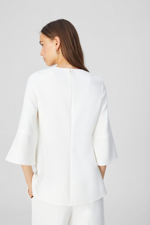 Fitted double-faced top in with an asymmetric ruffled hem. V-neck and bell 3/4 sleeve. Concealed zip at back. Model is 180 cm | 5′ 10″ and is wearing a size 38.