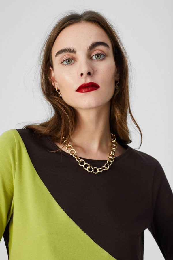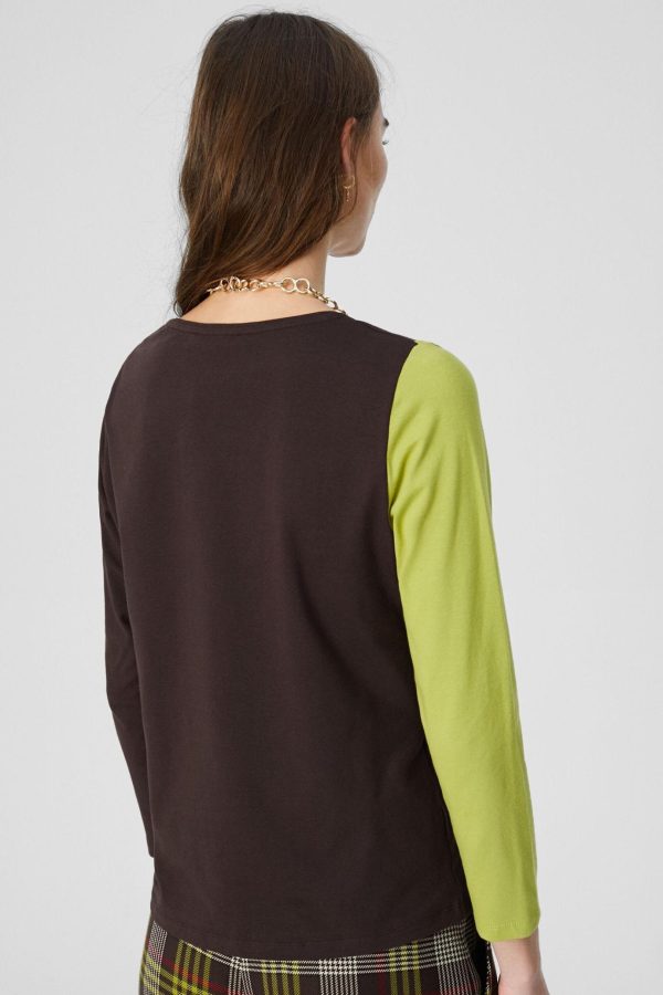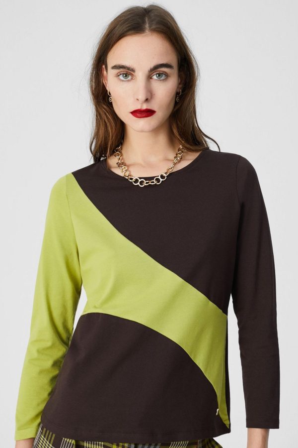 Fitted stretch-cotton top with an assymetric colour-block design. Round neck and long sleeve. Model is 179 cm | 5′ 10″ and is wearing a size Small.