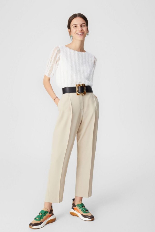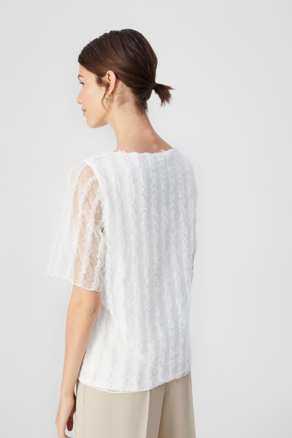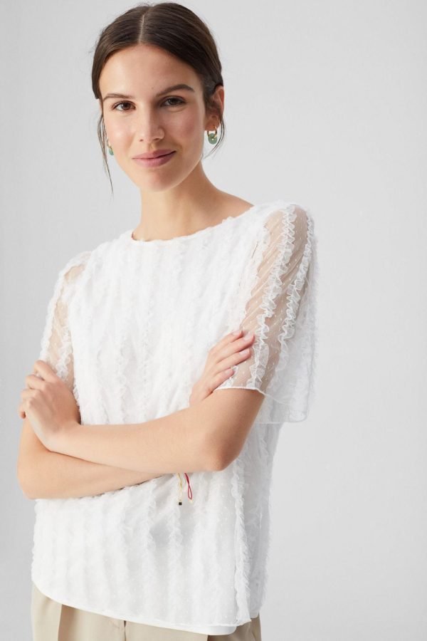 Straight fit t-shirt in tulle detailed with gathers. Boat neckline and short sleeves. Model is 174 cm | 5′ 8″ and is wearing a size Medium.
