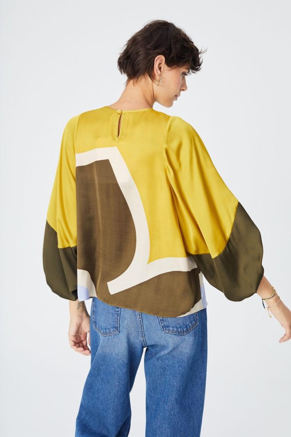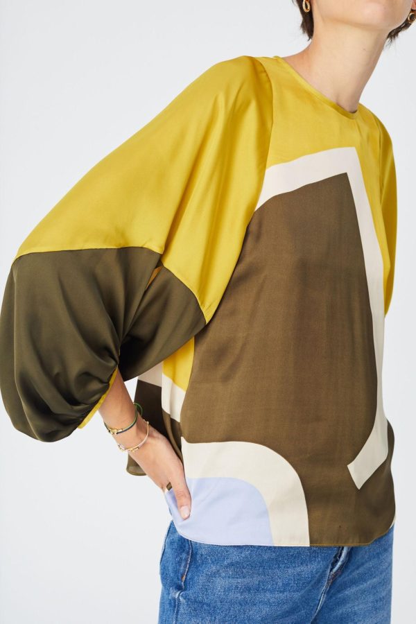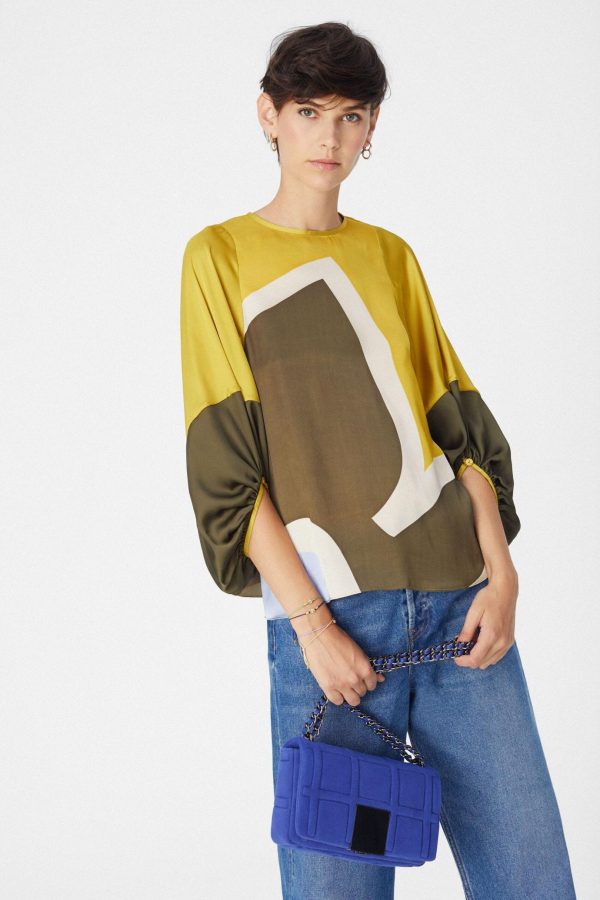 Twill top with a contrasting floral print. Crew neck and puffed sleeve. Model is 179 cm | 5′ 10″ and is wearing a size Small.
